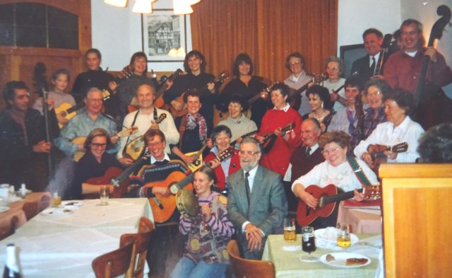 Es dauerte nicht lange, da kamen regelmäßig 25 Zupfmusiker zu den Proben ins „Haus des Gastes“ und – nach dem Wechsel des Raums – in die Gaststätte Schiffmann: Schon bald erklangen hier 1. und 2. Mandoline, Mandola, Gitarre, Cello, Kontrabass, Drumbass, Zither und Keyboard.