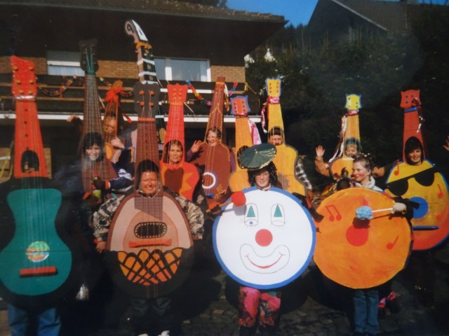 Karneval 1998 leitete Fred Schiffer die Zupfmusikfreunde an, Instrumente zu bauen, um als Gruppe im Zug mitgehen zu können.